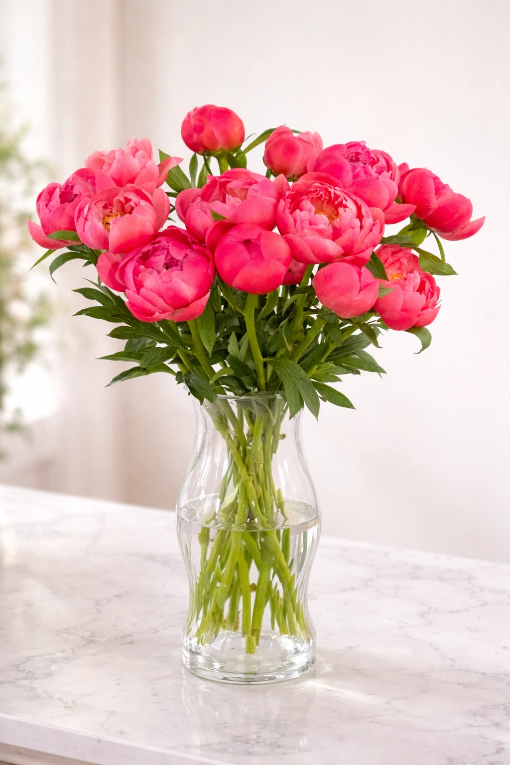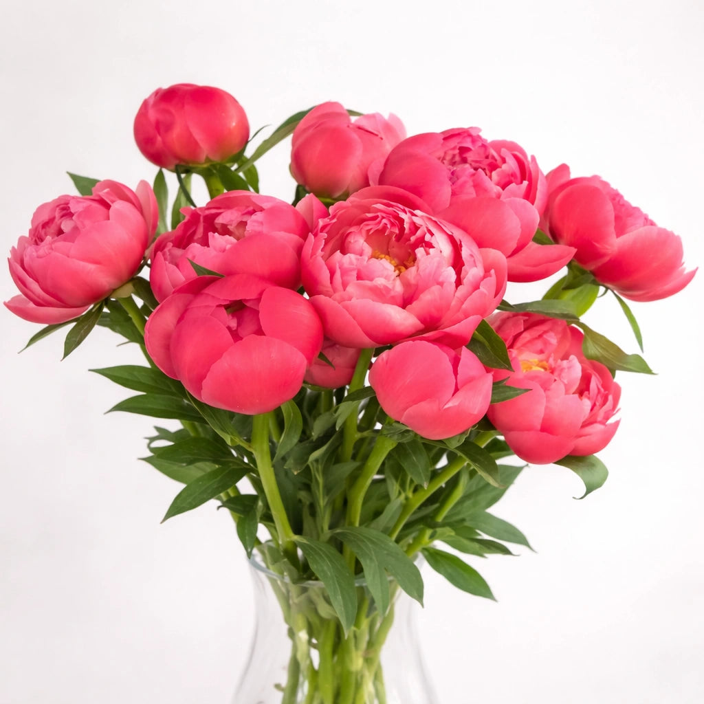 Ryškūs, pilni ir prabangūs bijūnai. Spalva gali šiek tiek skirtis dėl gėlių sezoniškumo.