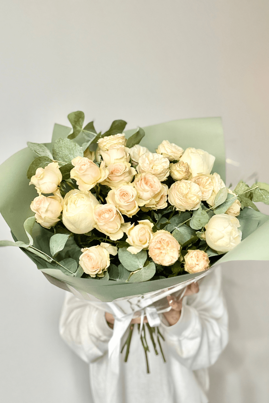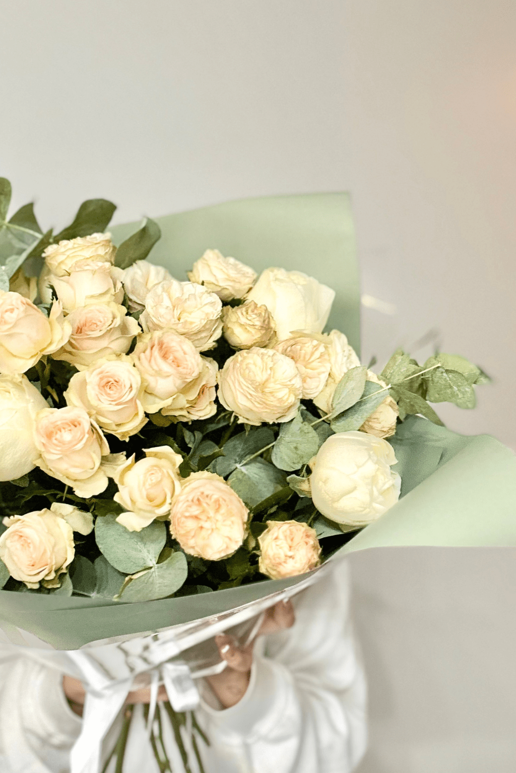 Magiškos ir karališkos gėlės vienoje puokštėje. Čia susipina bijūninės rožės ir eukaliptas - kiekvieno skoniui.