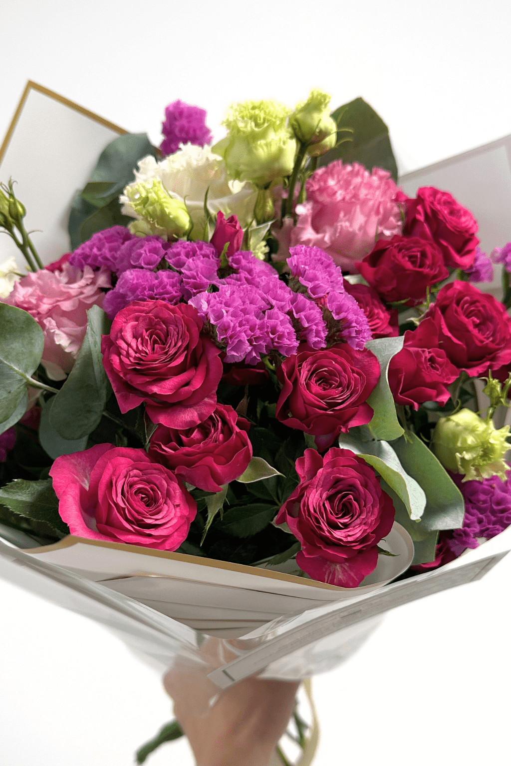 Puokštėje raudono vyno spalvos ir gaivi žaluma. Gėles puokštėje dabina eukaliptas.