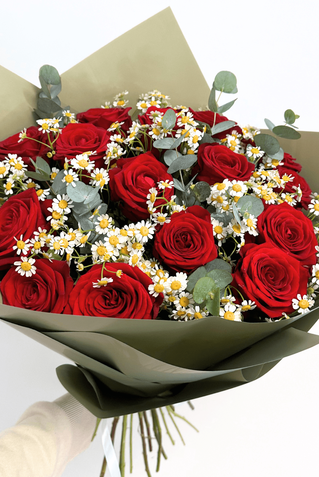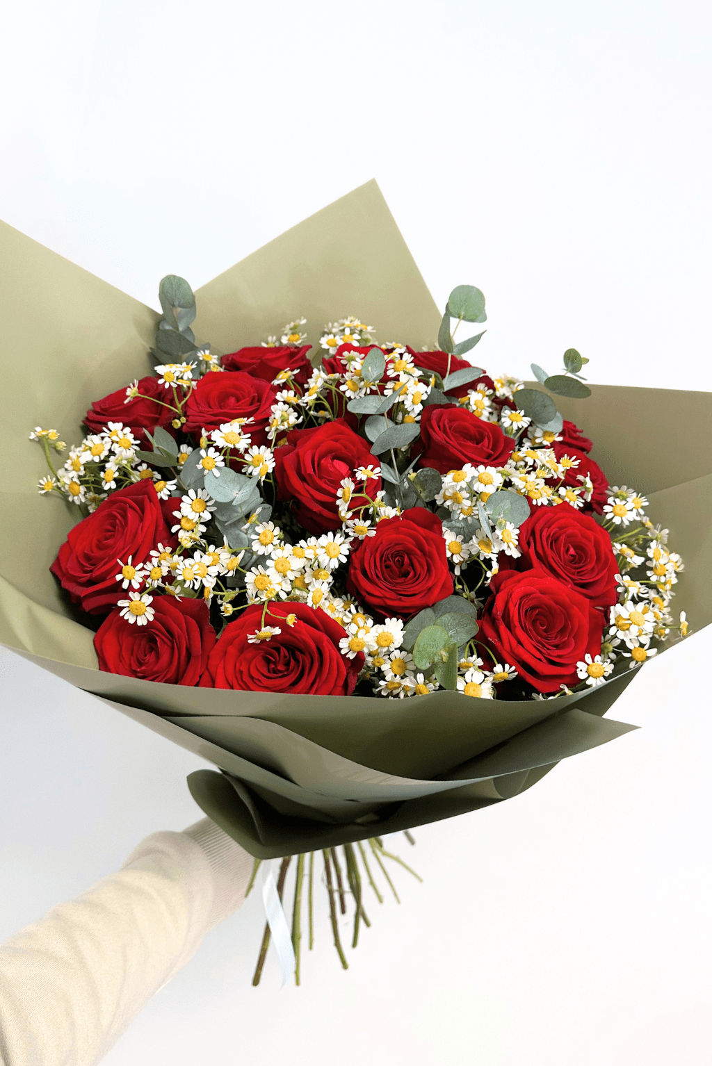 Raudonos rožės ir ramunėlės. Jas dabina prabangus eukaliptas. Tai lyg vasaros uoga puokštėje.