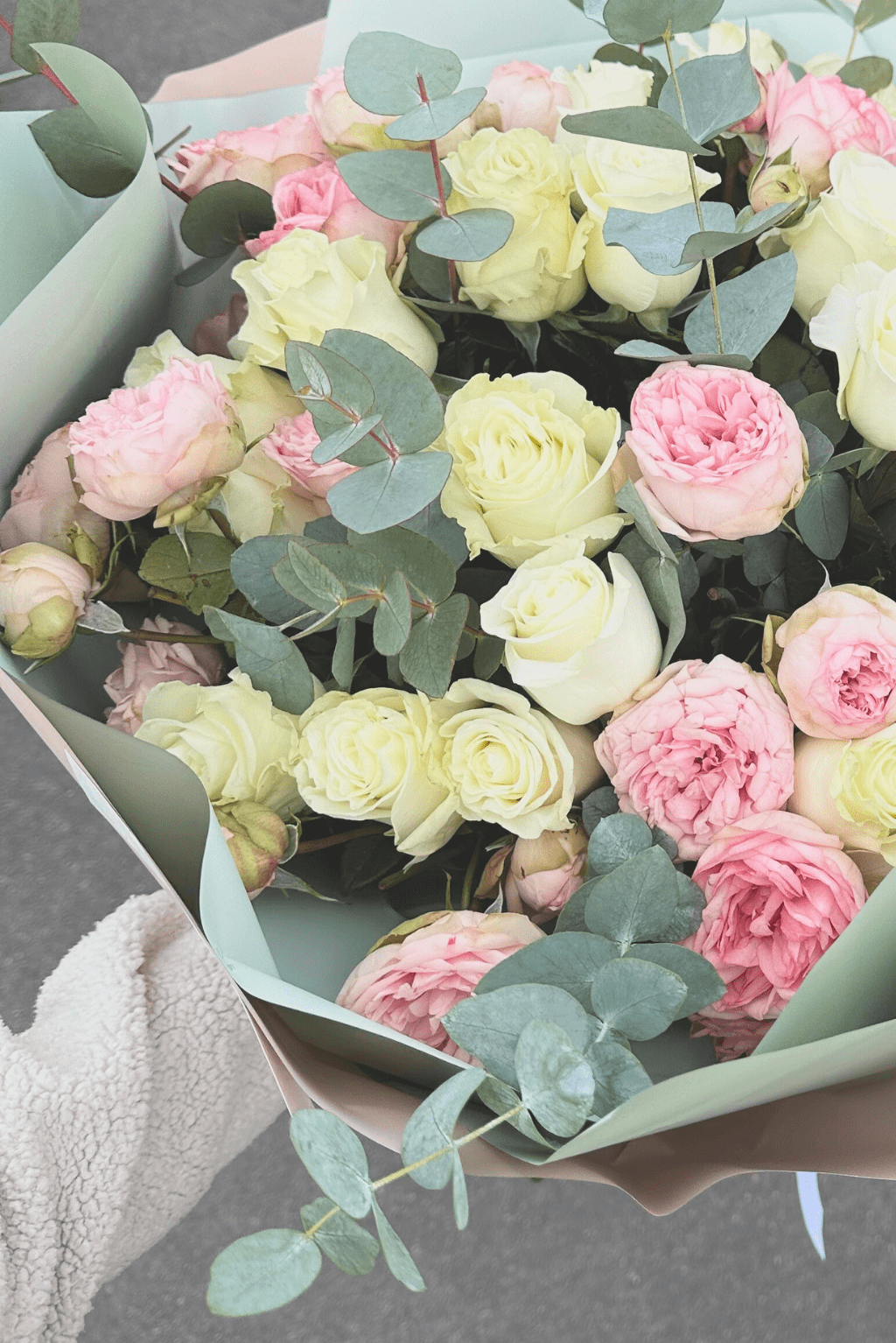 Baltos rožės, švelnios spalvos smulkiažiedės rožės, eukaliptas. Švelnumo ir grožio derinys. Nuotraukoje matote XXL dydžio puokštę.