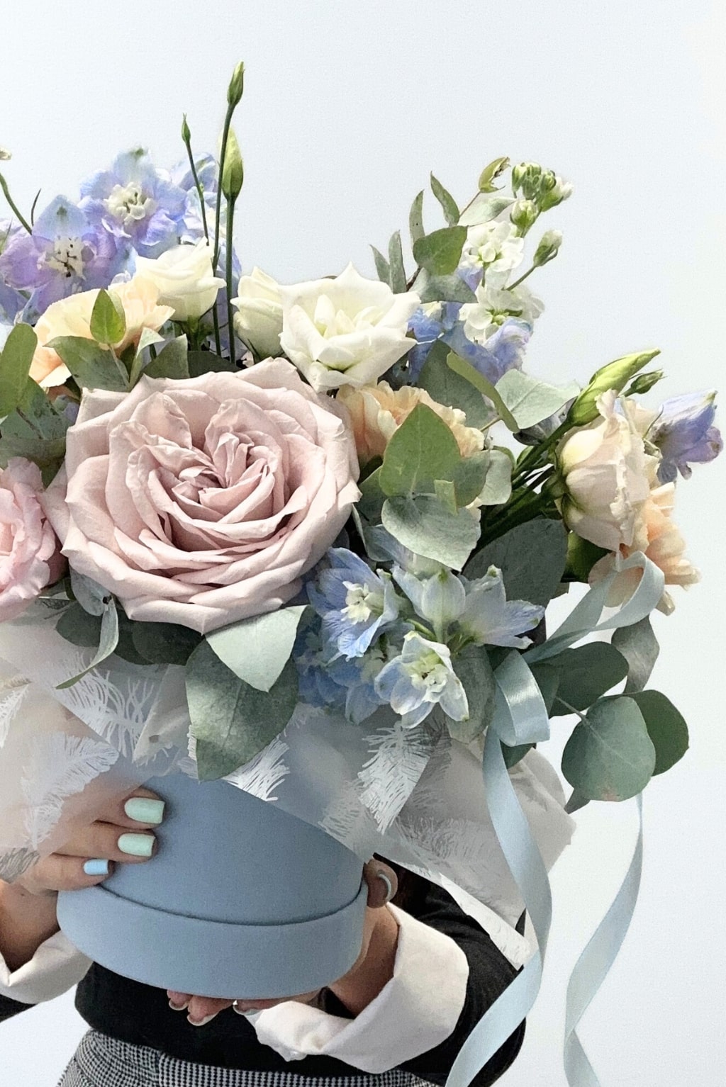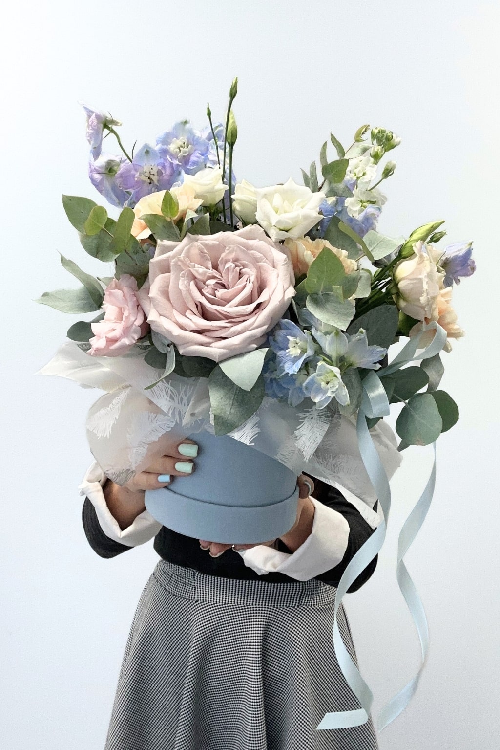 Pastelinių spalvų gėlės, sukuria tokią pasaką dėžutėje, į kurią norisi žiūrėti. Rožės, eukaliptas, eustomos ir delfinijumai.