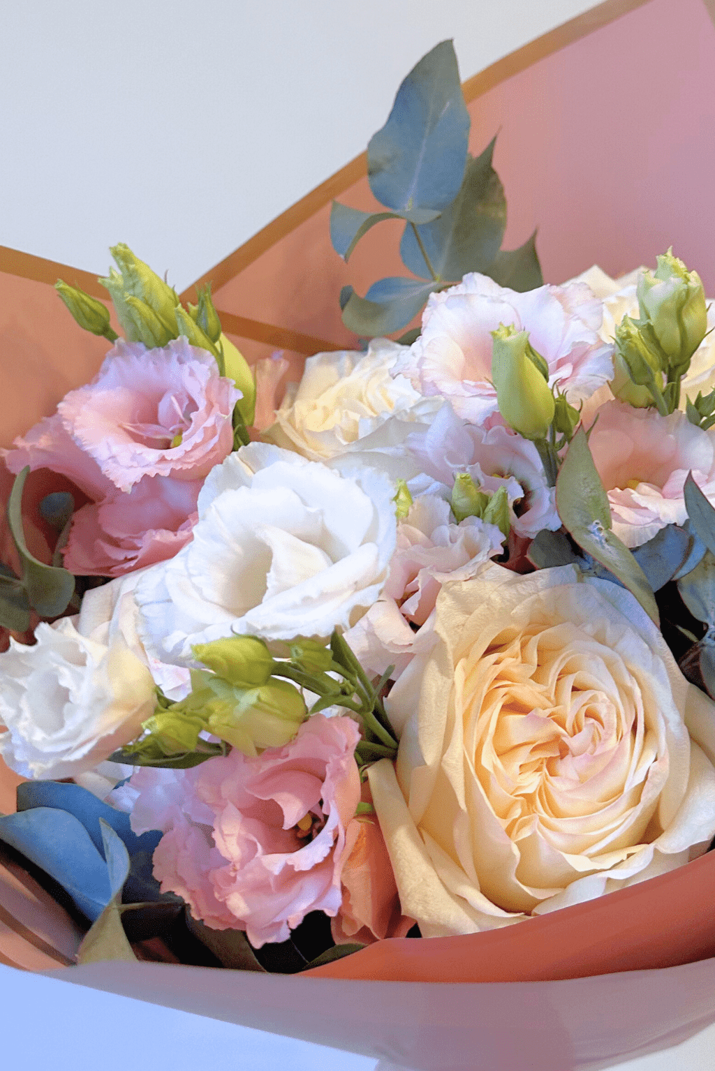 Puokštė kuriama su rožėmis, eustomomis ir eukaliptu. Nuotraukoje matote S dydžio puokštę.