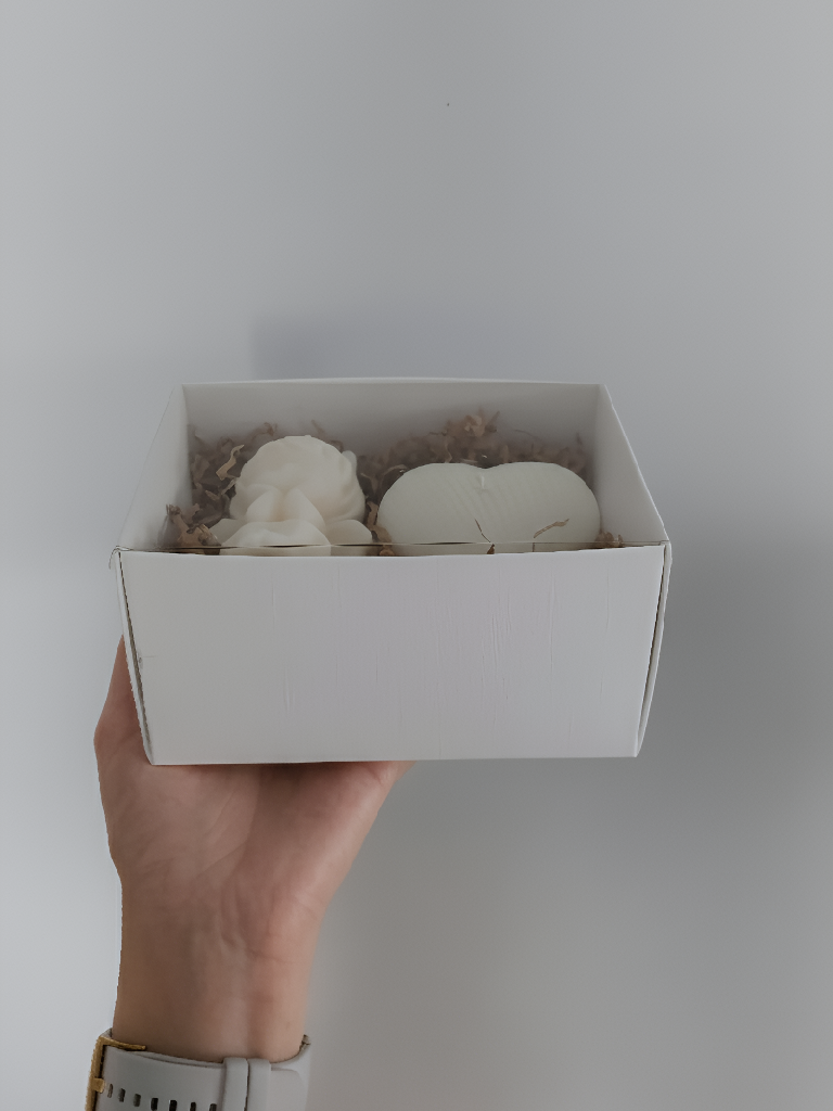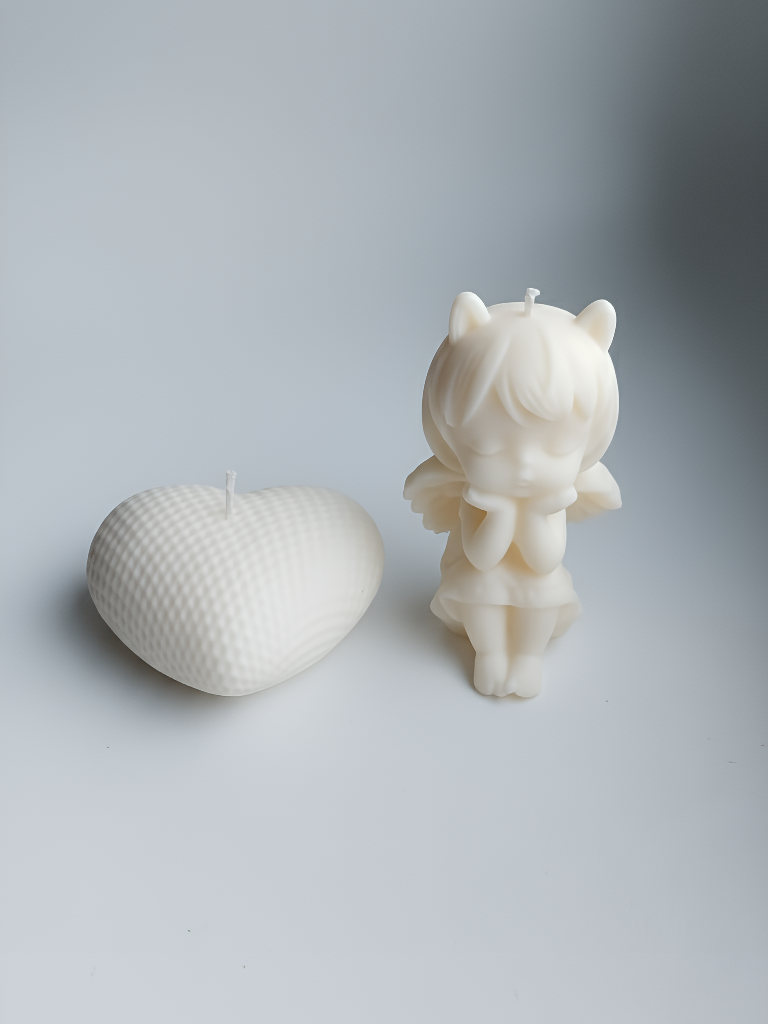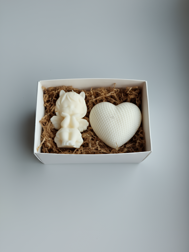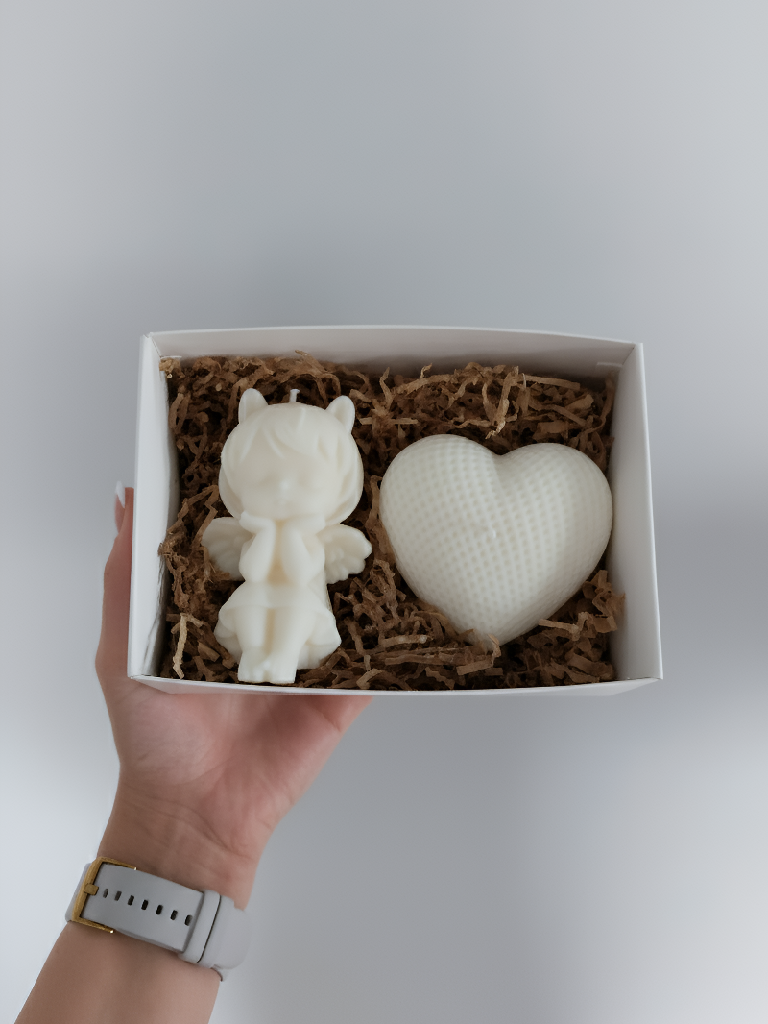 Rankų darbo,kvepiančios žvakės iš natūralaus augalinio sojų vaško su medvilnine dagtimi. Rinkinį sudaro 1vnt žvakė „Angelas” ir 1vnt žvakė „Širdelė”. White Musk kvapas.