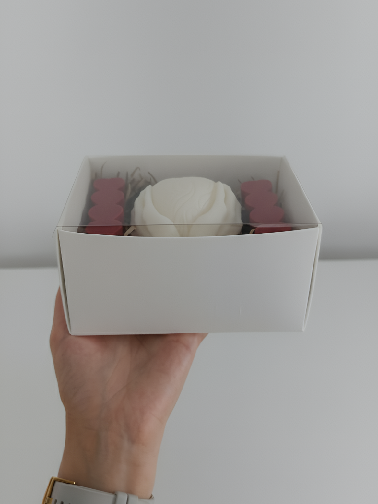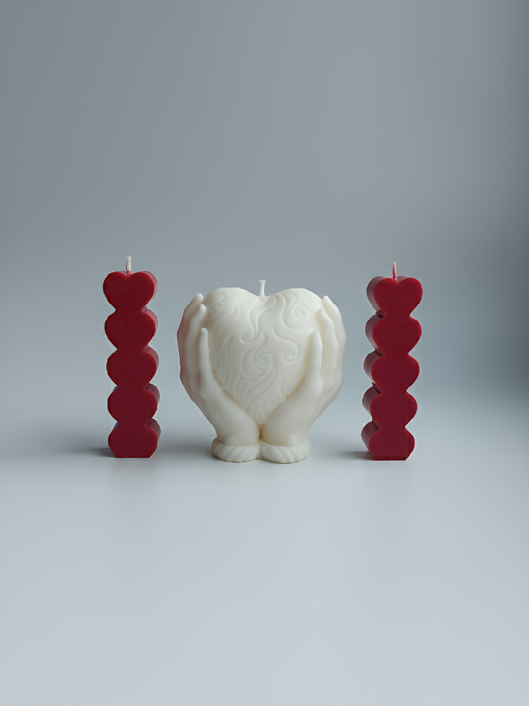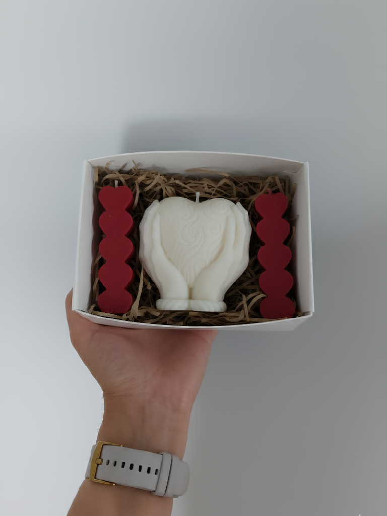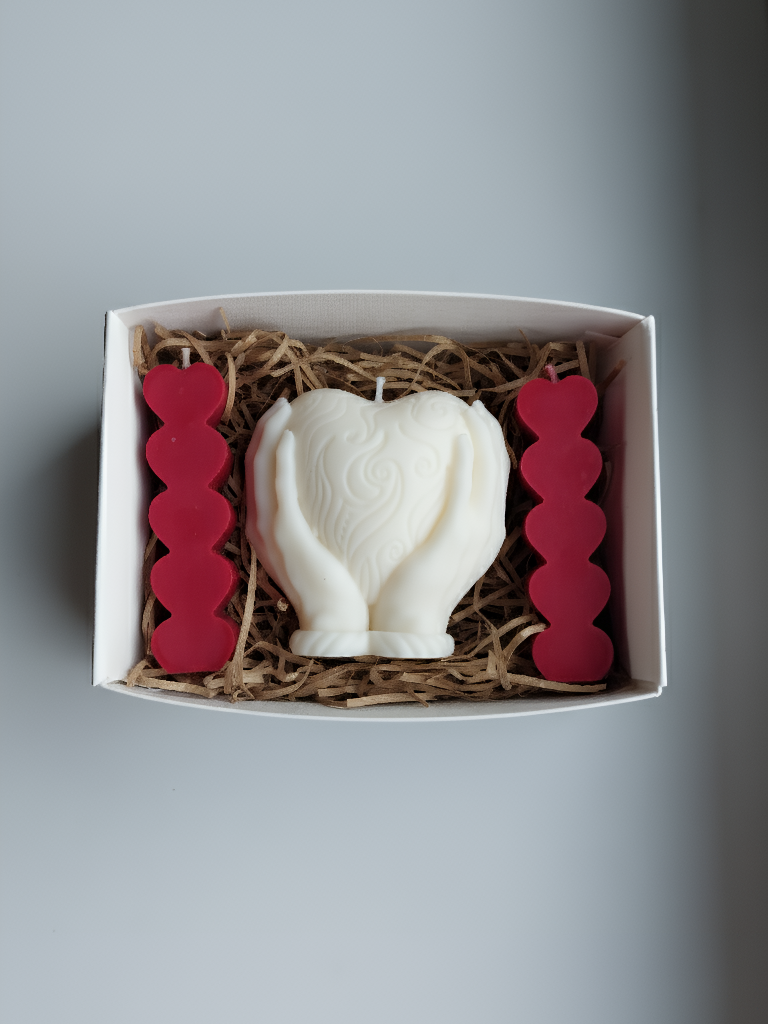 Rankų darbo,kvepiančios žvakės iš natūralaus augalinio sojų vaško su medvilnine dagtimi. Rinkinį sudaro 1vnt žvakė „Širdis Rankose” ir 2vnt žvakių „Širdelės”. White Musk kvapas.